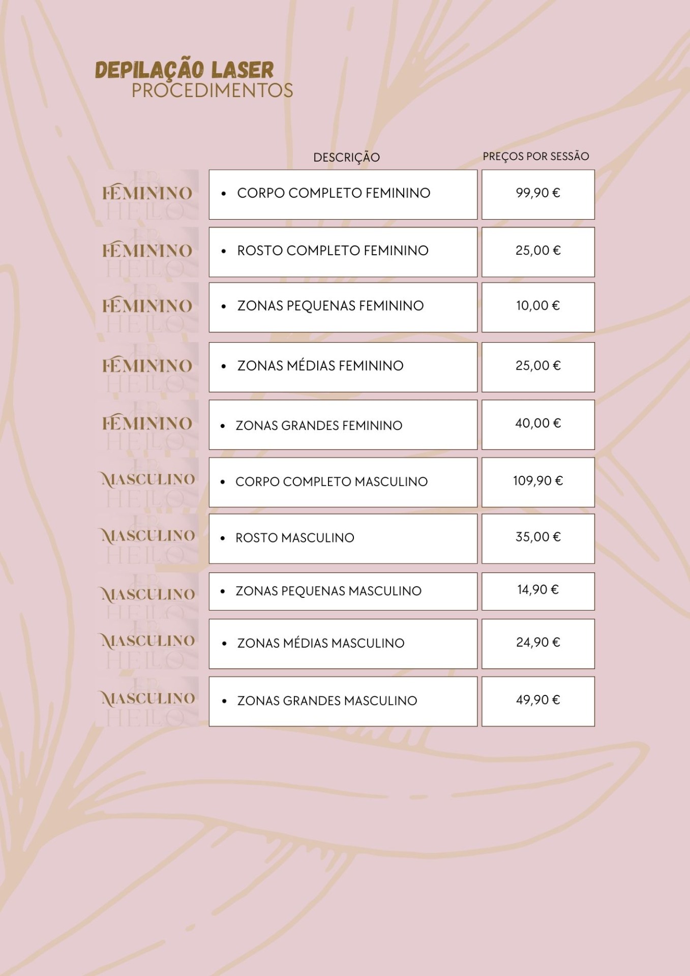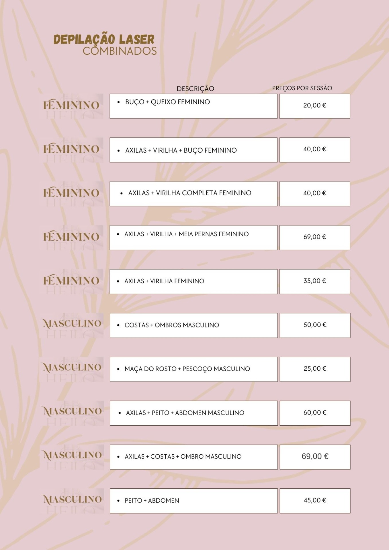 Rosto | Axilas | Pernas | Virilha | Costas | Barriga | Glúteos